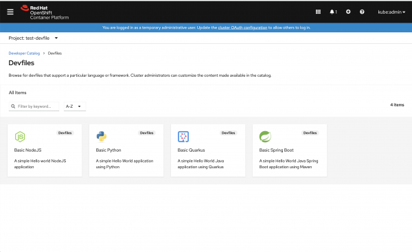 In the newest version of OpenShift, you can now find devfiles in the developer catalog, as shown in Figure 3. You can use these to bootstrap a new project for a particular language or framework. Each devfile provides sample projects for quick use.