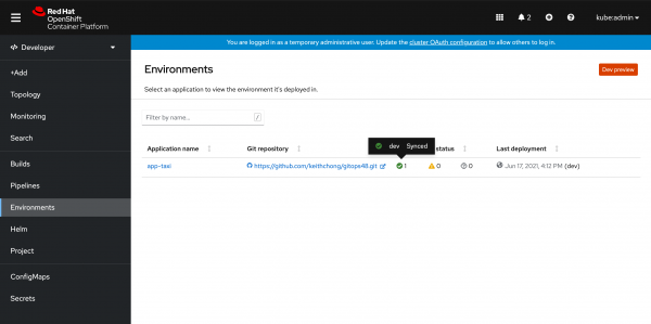 With OpenShift GitOps 1.2 installed, you will see some updates to the Environments page. You are now able to see the status of the environments to which each application has been deployed, as shown in Figure 6.