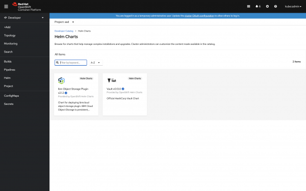 OpenShift 4.8 makes certified Helm charts available from the developer catalog. These charts are provided by our partners and ensure the best available integration and experience on OpenShift. A badge in the developer catalog makes it easy to identify certified Helm charts, as shown in Figure 2.