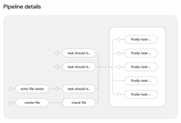 The OpenShift developer console now has feature parity with Tekton within the Pipeline Builder and other pipeline-related flows. The console supports WhenExpressions, finally tasks, and more. WhenExpressions are preceded by a diamond shape and finally tasks are enclosed in a grouping with a white background, as shown in Figure 5.