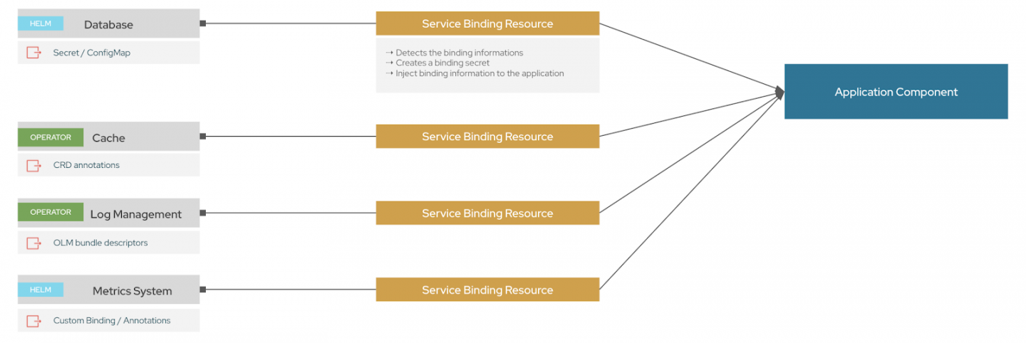 Today, when developers connect an application to a backing service, there is a fair amount of manual work to identify how and where to pull the different binding data. Each backing service has a different method and approach, which can create many discrepancies. Usually, developers have to follow an unreliable process to manually define and manage a whole set of Kubernetes resources, binding Secrets, ConfigMap, volume mounts, etc., that are specific to the environment into which the application is getting deployed.
