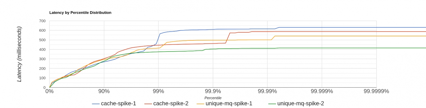 The blue and red lines represent two loads without enabling unique callout, and the rest of them are with unique callout enabled. It shows 99% of the request latencies are similar for both of the setups, but the setup with unique call-outs outperforms the default proxy setup during the initial cache miss period. (The final 1% of the diagram denotes the high latency requests during the initial cache miss period.)