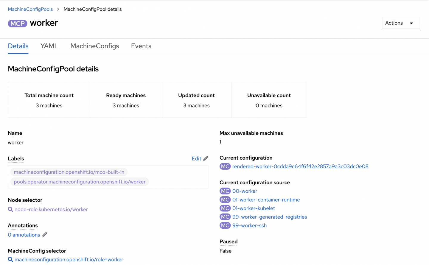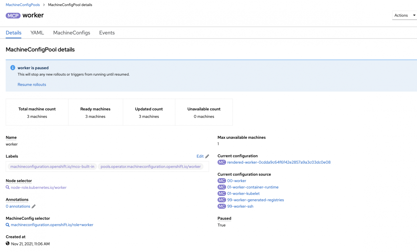 $ oc patch --type=merge --patch='{"spec":{"paused":false}}' machineconfigpool/worker