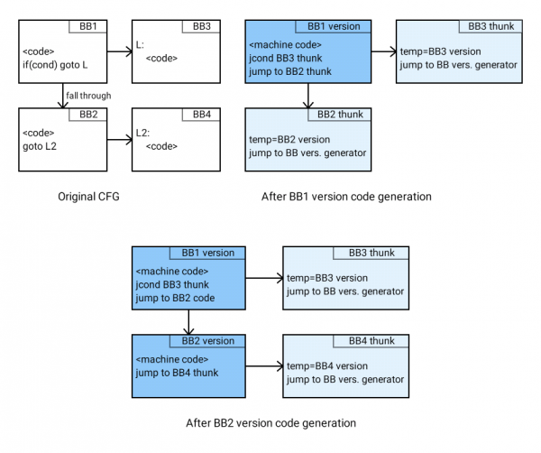 Initially, a function thunk redirects to a machine code generator, which works in a special mode. It only optimizes the function but does not generate machine code. Instead, it creates a version of the function's first basic block, redirects the function thunk to the basic block version generator, and calls it. The next calls modify the function thunk whenever a new basic block version is necessary. Figure 4 illustrates how the function thunk changes when the limit for the number of basic block versions is three.