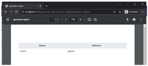 In your browser, enter the generate-report URL with a name and address as parameters, and you get a PDF ready to download and print, as shown in Figure 1.