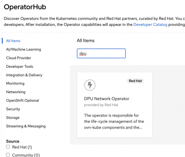 When the cluster is deployed on the BlueField, the OVN configuration is automated with the "DPU Network Operator"; this operator can be installed in the OpenShift console or with the oc command.