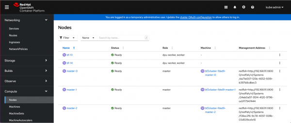 Infrastructure cluster: We can list the nodes of the Infrastructure cluster, including the BlueField-2 nodes with the machine-config pool name dpu-worker:
