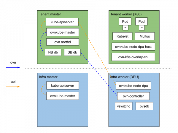 - The ovn-k8s components are moved from the x86 host to the DPU (ovn-kube, vswitchd, ovsdb).