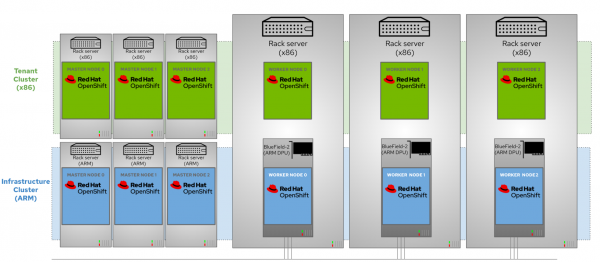 In this architecture, DPUs are provisioned as worker nodes of the Arm-based OpenShift infrastructure cluster. This is the blue cluster in Figure 1. The tenant OpenShift cluster, composed of the x86 servers, is where user applications typically run. This is the green cluster. In this deployment, each physical server runs both a tenant node on the x86 cores and an infrastructure node on the DPU Arm cores.