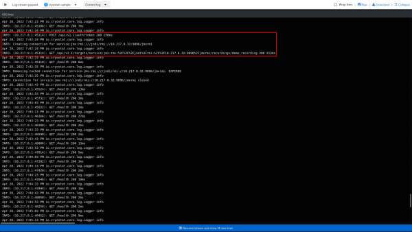 Figure 2 shows the main Cryostat container logs when a recording download request from the web client is received.