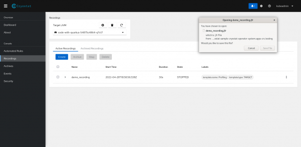 Cryostat 2.1 improves the download flow by using the HTML 5 download attribute available in most browsers. Specifically, an anchor element is created with the href attribute set to a URL for the resource provided by the back-end, and the download attribute is set to the file name. When the anchor is clicked, the “Save File” prompt appears (see Figure 1).