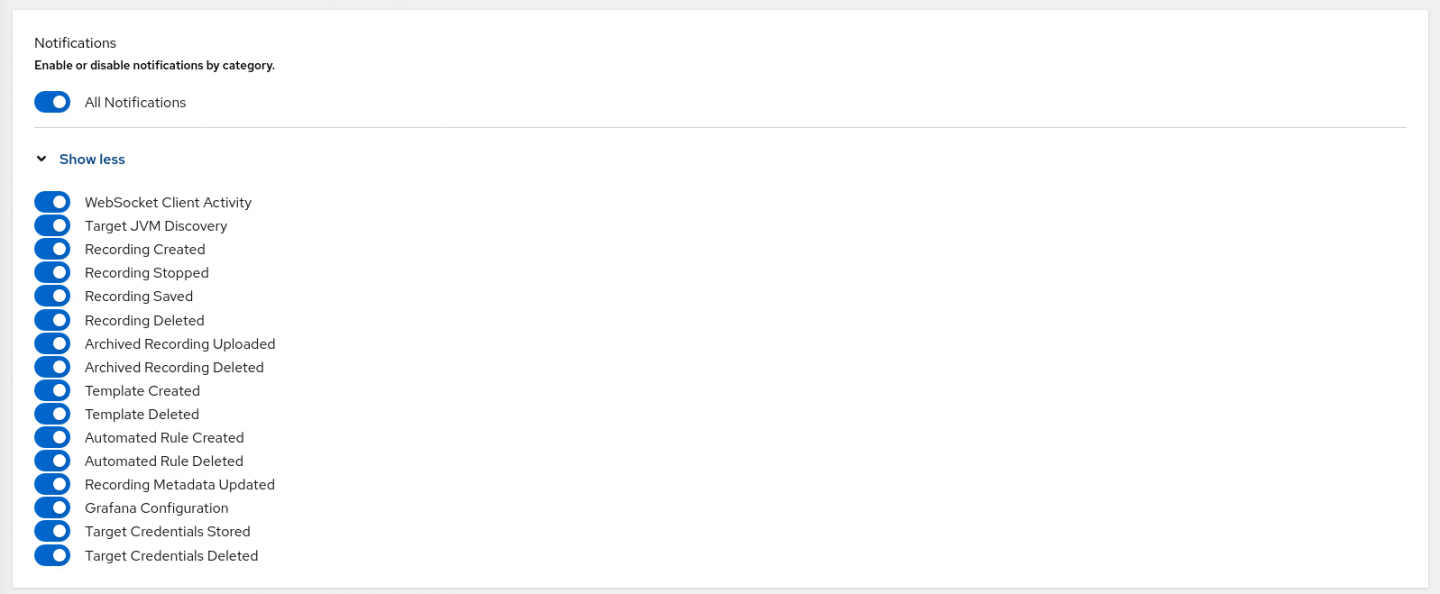 When a notification category is disabled, the messages are still sent over the WebSocket connection, but the toast notification in the web client simply isn't displayed. The user's chosen settings are entirely on the web client side and are persisted in the browser's local storage. The web client still receives and holds the notification information in memory. Therefore, if you re-enable a notification category, any previously emitted notifications in that category will still be available for you to read. This way, Cryostat avoids cluttering the user interface with notifications while still preserving a log of actions and state changes for inspection if needed.