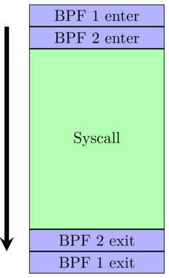 The main problem with measuring performance is measuring the right thing. In the case of measuring the performance of a program responsible for tracing another, this can be quite challenging. Consider sys_enter and sys_exit tracepoints that fire before or after a syscall is executed. We have BPF programs performing some activity when triggering those tracepoints. The exercise is to measure time spent in those programs.