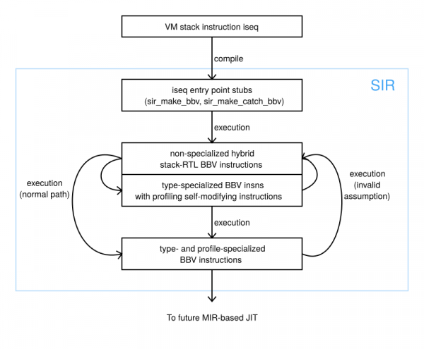 To implement a decent MIR-based JIT compiler, I decided earlier to develop some features with a design specific to CRuby. I use dynamically specialized instructions for the CRuby VM and generate machine code from the instructions using the MIR compiler in its current state.