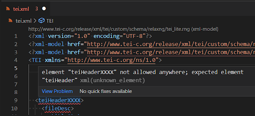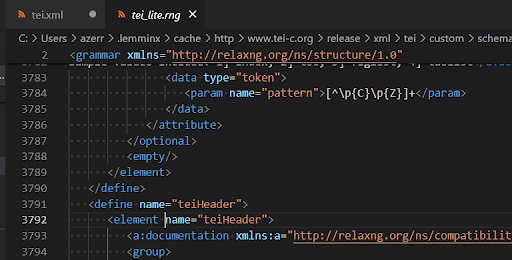 When you click on this menu item, VS Code will open the rng or rnc grammar file and place the cursor on the proper element/attribute declaration as shown in Figure 6.