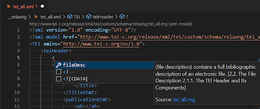 - RelaxNG support provides completion, hover, and validation in XML files based on RelaxNG schemas.