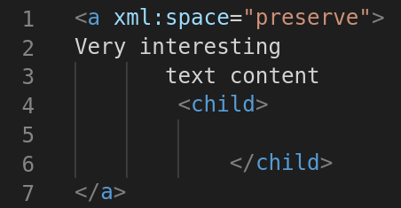 The new experimental formatter preserves all non-whitespace content and inserts or removes spaces to correctly indent the XML content. In the following sample, two TextEdit are generated. The insert/replace characters avoid losing invalid content.