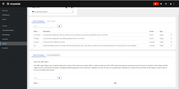 Once we have a target running with the agent, we can open up Cryostat’s web interface and select it from the list. In Figure 1, the events page displays the agent options.