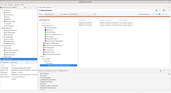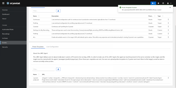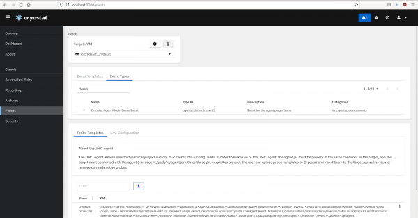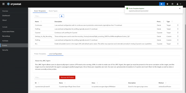 This configuration will inject a custom flight recorder event called a Cryostat agent plugin demo event and have it emitted whenever the retrieveEventProbes method in AgentJMXHelper is called. This means that whenever Cryostat asks the agent for the currently active probes, it will also emit the custom JFR event. More information about this configuration can be found in this article.