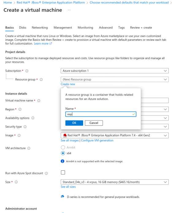 You can choose to select an existing resource group, or create a new one, as shown in Figure 2. You will also need to enter a virtual machine name. Enter "eap" in this field.