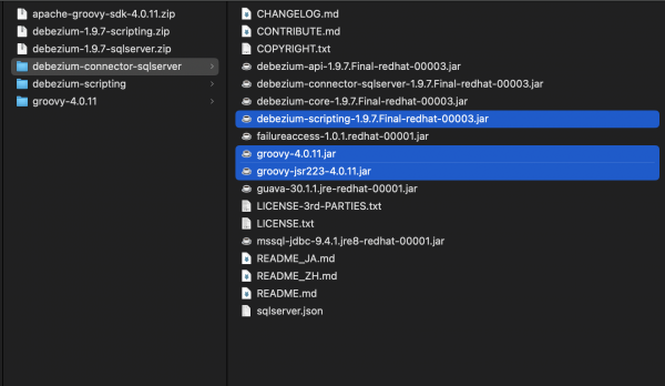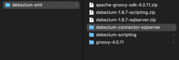 Then go to the groovy-4.0.11/lib folder and copy the jars groovy-4.0.11.jar and groovy-jsr223-4.0.11.jar. Place them in the debezium-connector-sqlserver folder. At this point, your folder should look like Figure 5. Keep in mind that your versions may be different. These are the versions available at the time of this article.