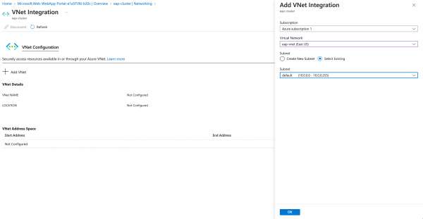 Select the VNet we created previously and select the existing "default" subnet, then click OK to continue. VNet integration should now be enabled for this web app.