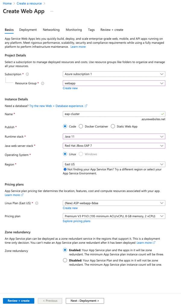 Once the virtual network is created, we can create a JBoss EAP app service and configure it to use the newly created virtual network. Navigate to the Azure App Services page and click + Create to display the Create Web App form (Figure 2).