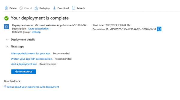 Complete the form as shown above and click Review + create, then click Create to create the web app. You will be redirected to the deployment page, shown in Figure 3.