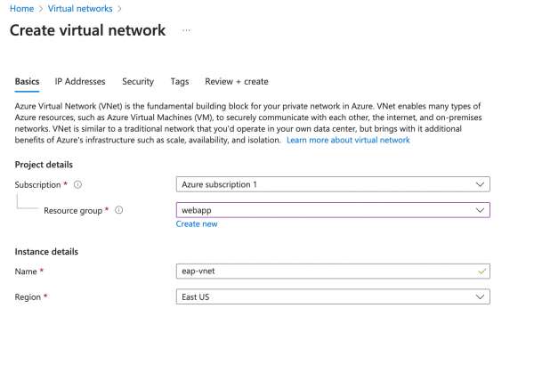 Choose a resource group (or create a new one), give the virtual network a name, and click Review + create to proceed.