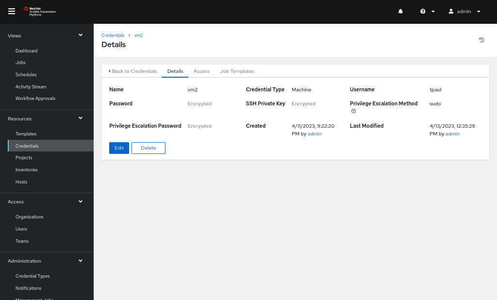 - Navigate to the Credential tab and add a credential with type Machine, username and password as that of our managed node, and private key as copied over from control node file: ~/.ssh/id_rsa (Figure 4).