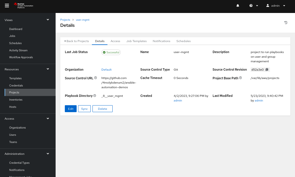 - Add the GitHub URL to the Source Control URL field: https://github.com/4molybdenum2/ansible-automation-demos/tree/main/user_mgmt.