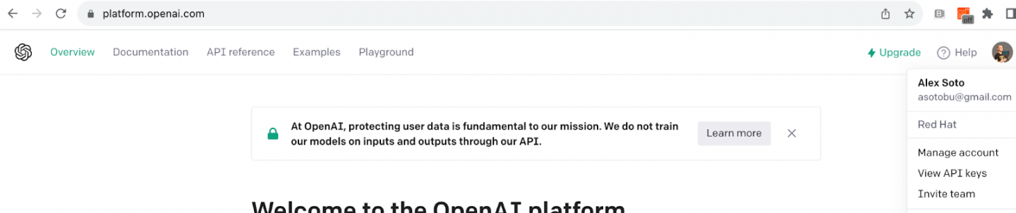 Once on the OpenAI website, create an API key to authenticate from the Quarkus application. Go to the OpenAI API page, click on the username (top-right), and select View API keys from the drop-down menu, as shown in Figure 1.