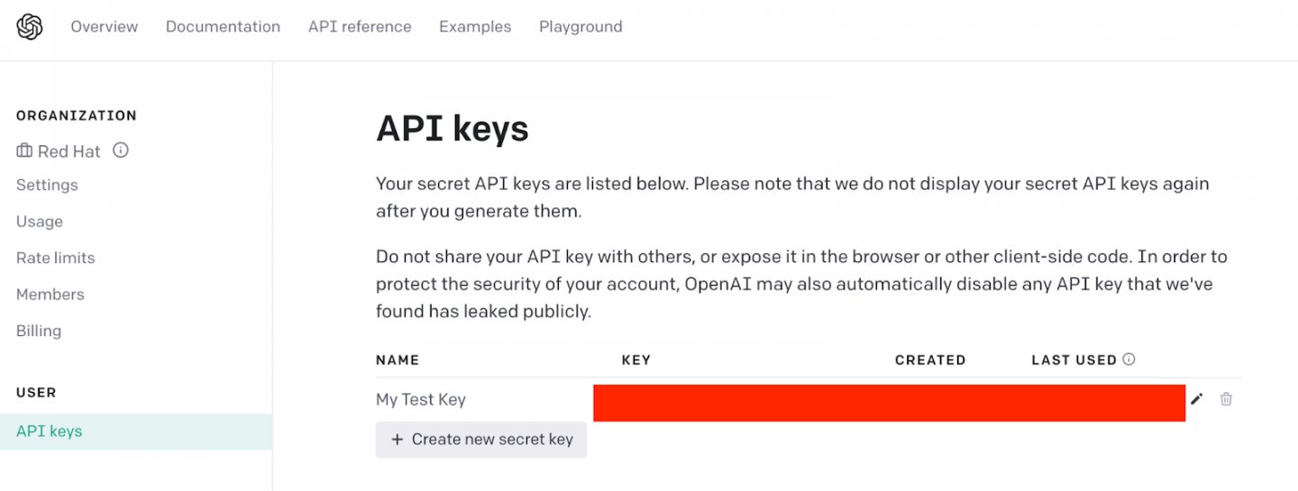 Click the Create new secret key button to create a new API key (Figure 2). You'll need to copy this key somewhere safe, as you'll need it later to authenticate in the Quarkus application. As the name implies, keep it secret!