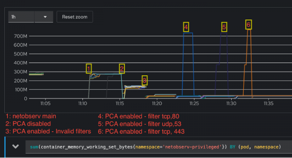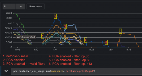 As you can see in Figure 4, the graph has been annotated with 6 labels, one for each usage scenario. The CPU usage increases with PCA enabled while the agent starts; this is because the eBPF-enabled kernel sets the filters up, but as you can see from labels 4, 5, and 6, the increase in marginal when the actual filtering is on. Since we expect most traffic in scenario 6 (<tcp,443>) due to higher volume of packet processing, the CPU usage is higher but reduces as soon as the capture agent is stopped.