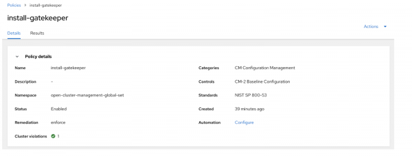 After the policy has been deployed to all your clusters and the Gatekeeper Operator has successfully been installed, you can see the policy marked as compliant, as shown in Figure 2.