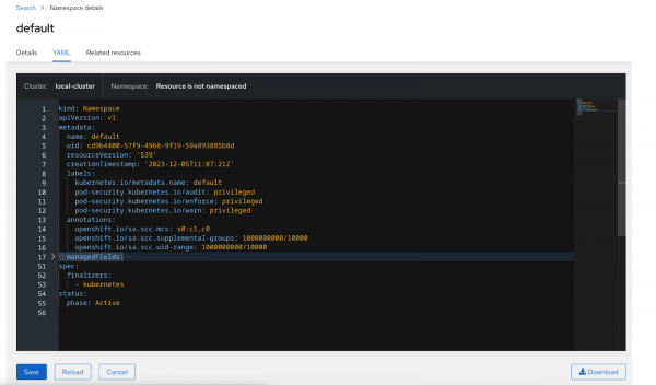 - From the table, click any of the View YAML links to utilize Red Hat Advanced Cluster Management Search to view the YAML of namespaces that failed the audit on the managed cluster. For example, if you click on View YAML for the default namespace, then you would see the YAML shown in Figure 5.