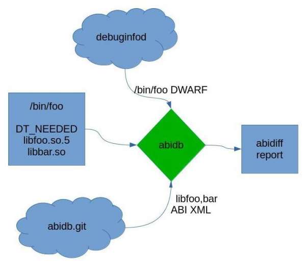 The other mode is abidb --check BINARY, as shown in Figure 2. This mode takes a given binary, identifies all the shared libraries it uses (by the outgoing DT_NEEDED SONAME references). Then, using the libabigail abidiff tool, it then compares the binary to the ABI XML of each shared library with the same SONAME from the git repo. If this reveals any ABI mismatch, then details are printed, and you will find out that some version of a shared library is not in fact compatible with the binary. Note that it's not necessary to install the shared library files at all: just get a copy of the XML git repo from somewhere. In fact, the comparison target need not be the same distribution you're running, as long as someone collected its ABI XML bits and merged them into your git repo.