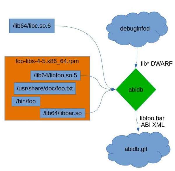 This first version of abidb has two modes. abidb --submit /path/to/libfoo.so generates an ABI XML document for the given file using libabigail's abidw, and deposits it into an appropriate place in the current git repository. abidb can also process entire RPM/DEB archive files, and run the "submit" operation on each shared library found inside. If debuginfo is not immediately available, the tool consults any configured debuginfo servers to fetch them automatically. You may rerun to add data for new versions installed since last time. This results in a Git branch that you may push to a central repository, or use in situ. All the usual git tools and techniques work to manage distribution, control, and garbage collection. Figure 1 depicts this mode.