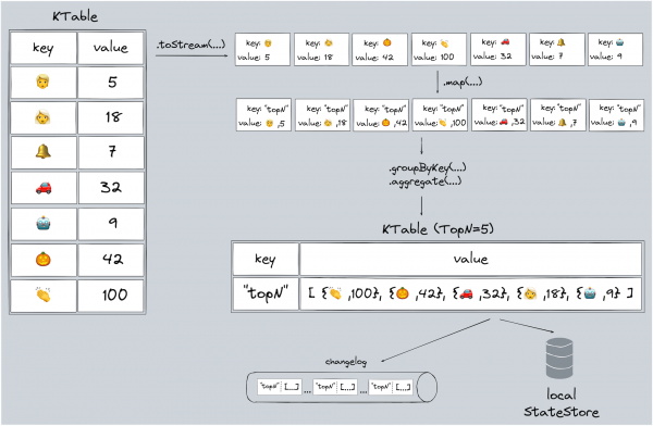 KTable<String, TopEmojis> mostFrequent = emojiCounts.toStream()