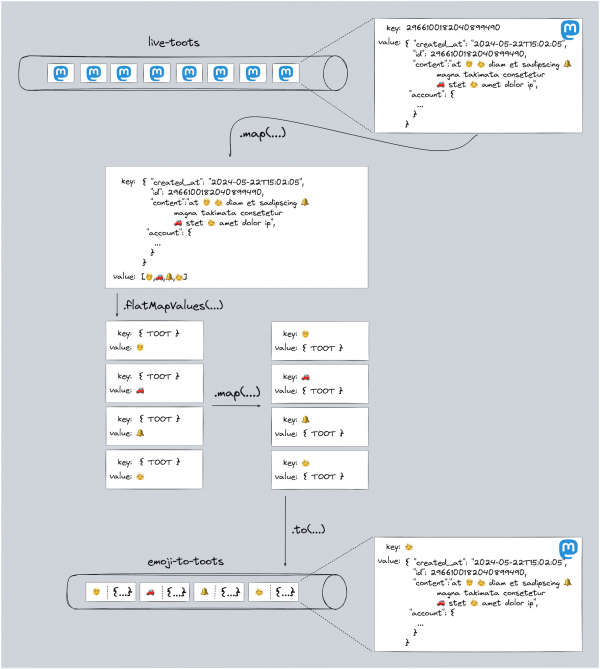 Let's start with the stateless processing first, during which for each unique emoji that occurs in a toot, a new record—composed of the emoji as key and the toot itself as value—gets written into a separate KafKa topic named emoji-to-toots.
