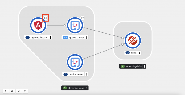 In the OpenShift web UI topology view you can simply click the Open URL link symbol to follow the respective Route. See Figure 14.