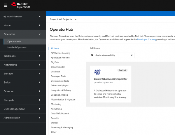 oc new-project coo-demoWe will use the OpenShift Operator Lifecycle Manager (OLM) to install the Cluster Observability Operator. In the OpenShift Administrator menu, select Operators and then OperatorHub. Search for cluster observability, as shown in Figure 1.