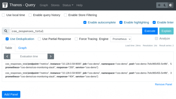 $ oc get pods NAME READY STATUS RESTARTS AGE coo-demo-7bc8c649dc-7sww8 1/1 Running 0 3m37s prometheus-coo-monitoring-stack-0 3/3 Running 0 2m1s thanos-querier-coo-demo-7654cd6df9-wqbcg 1/1 Running 0 8s