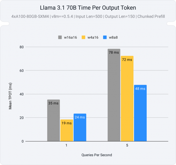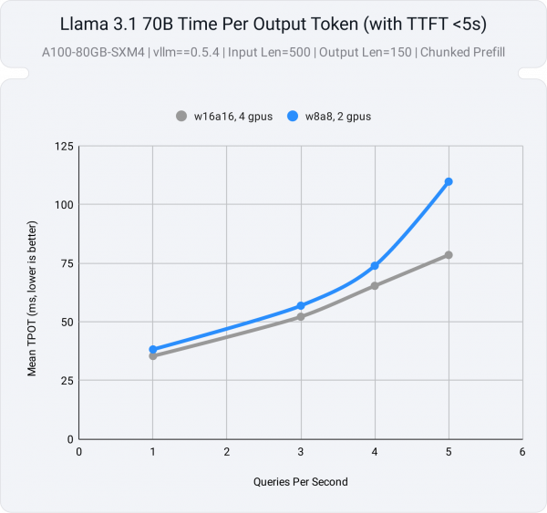 For a 70B model on an A100 system, we see that the W8A8 model achieves similar latency performance with just 2 GPUs compared to the unquantized model running with 4, meaning similar latency guarantees with half the resources!