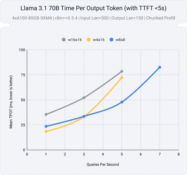 At low QPS, weight-only quantization offers improved latency relative to an unquantized model. However, as the server load increases and becomes compute-bound, the performance of the weight-only model levels off, matching the unquantized model. In contrast, the activation quantized model performs better under high load, supporting more queries per second before the system becomes overloaded and TTFT exceeds our limits for a responsive application.