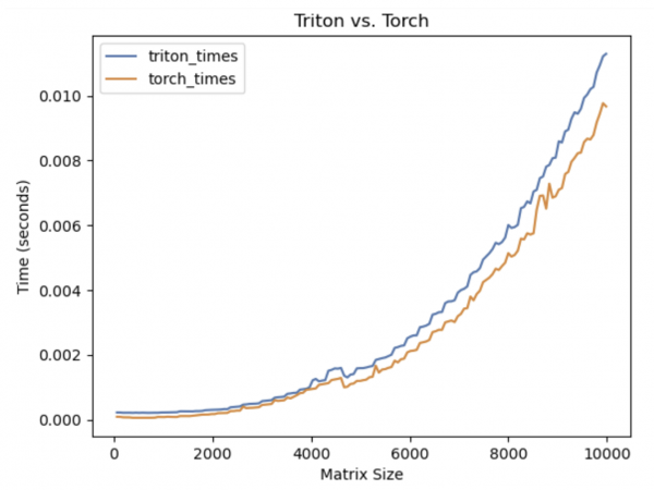 Notice that it’s not clear whether the Triton version is necessarily even more efficient—because it works on a per-block basis, it is entirely possible that the entire function is just running on a single thread, which has to process the entire block size. The Triton team claims that they have done some serious work under the hood in terms of automatic parallelism and compiler optimizations, but due to a lack of documentation, it is difficult to determine which custom block operations will be fully parallelized.