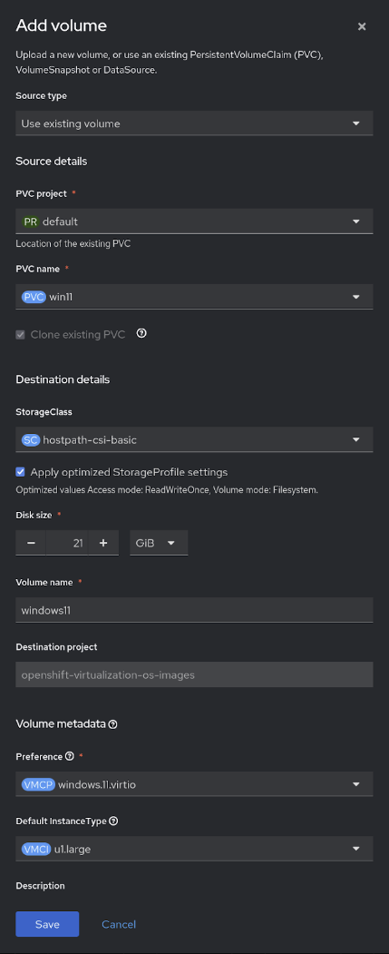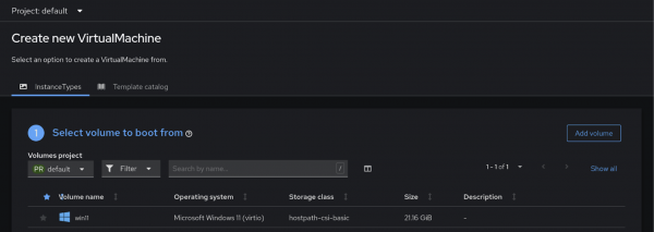 Note that you can select another StorageClass and Default InstanceType depending on your cluster resources and/or needs. However, due to the known CNV-42080, do not use win11 as the Volume name value.
