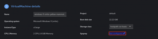 The section VirtualMachine details will show the summary of the selected options. In this step, you can modify some extra parameters like the name of the VM or the Storage Class or add a sysprep. As mentioned before, a sysprep can be used to automate some steps of the configuration process. You can click the Sysprep button highlighted in Figure 15 to do so.