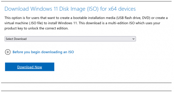 To get started, we are going to need to get the Windows 11 ISO download link. In this example, we are going to download from Microsoft’s website, though the ISO could also be provided by an internal web server. For such purpose, we need to access the Microsoft official download website. On the website, you should be able to find Download Windows 11 Disk Image (ISO) for x64 devices section as shown in Figure 1.