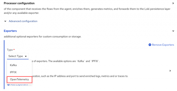 To do this, after you install the Network Observability operator, go to Operators > Installed Operators. On the Network Observability row, click the Flow Collector link under the Provided APIs column. Click Create FlowCollector. Make sure you are in Form view. At the bottom, click Advanced configuration to reveal the Exporters section (Figure 1).